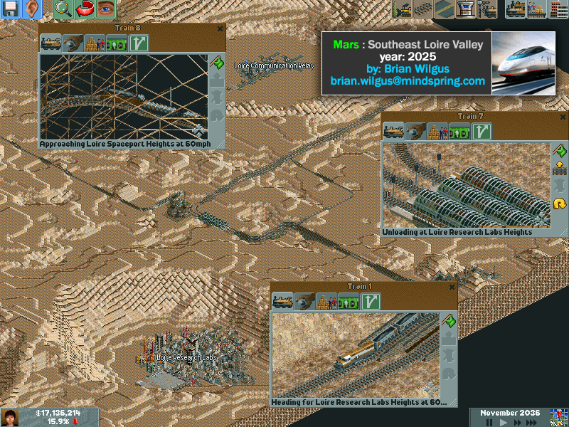The topography is made from actual Martian topography in the Southeast Loire Valley (http://astrogeology.usgs.gov/Teams/Geomatics/photogrammetry/topography_mars.html) Map MTM-15/337. Five cities exist on the map in the largest craters to provide protection from meteors. Industries include: Coal, Ore, Steel, Factories, Oil, Chemicals and Refineries. Of course you should also build bullet trains and connect the people of the cities together. 4 AI are set to the highest difficulty. In play testing I found the AI either gets involved early or never builds anything. A separate no-AI scenario will be released also.