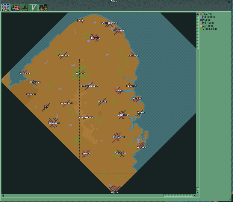 Build a transport network in the east of England. Achieve a performance index of 90%.